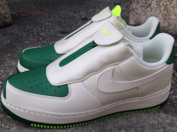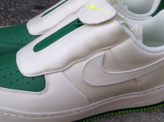To coincide with the return of the Nike Zoom Flight 98 ‘The Glove”, Nike has also created special “gloved” version of its classic Air Force 1 sneaker. “The Glove” Air Force 1 Low features an off-white nylon mesh and white upper, joined with green leather on the toe. A green zipper has been attached to the top to release a similar shroud. A volt tongue logo serves as the finishing touch. If you’d like to get your hands on these, they are now available and can be purchased on eBay. Here’s a direct link to the listings.